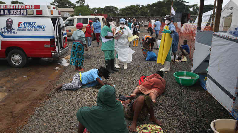 After arriving by ambulance, people with suspected Ebola virus lie on the ground waiting for beds before being admitted to the Doctors Without Borders Ebola treatment center in Monrovia, Liberia, last week. The 120 beds in the center were filled almost immediately.